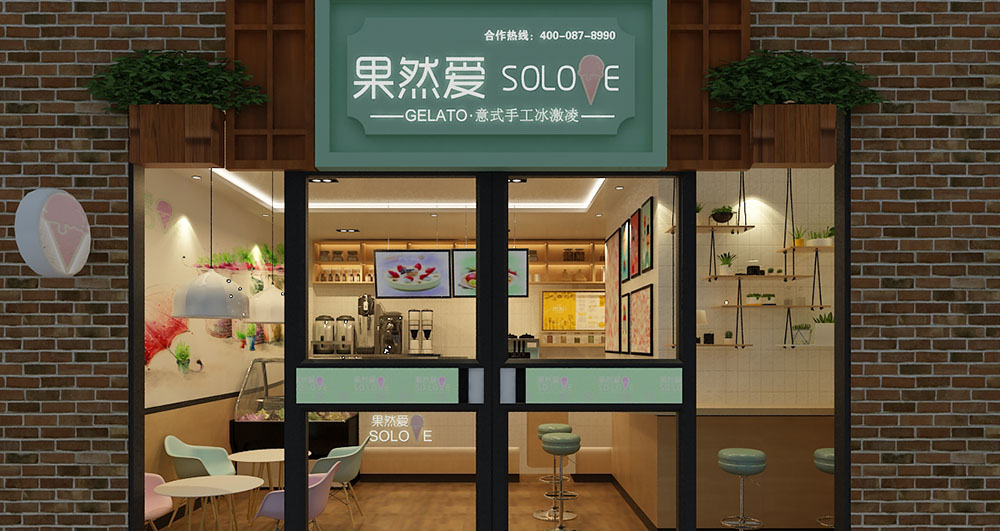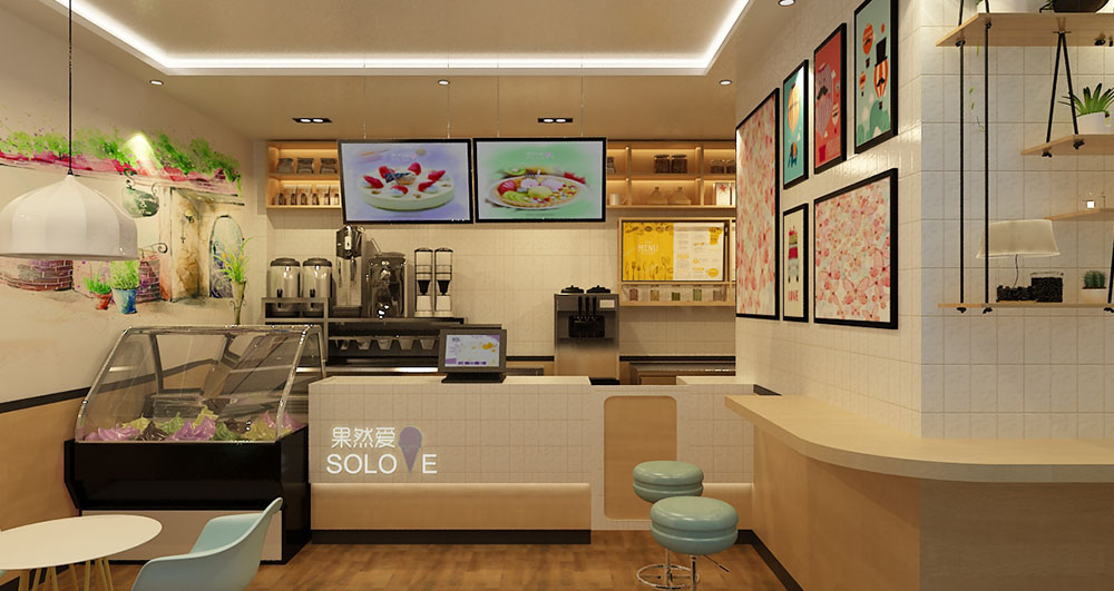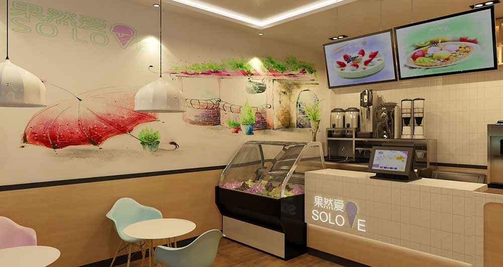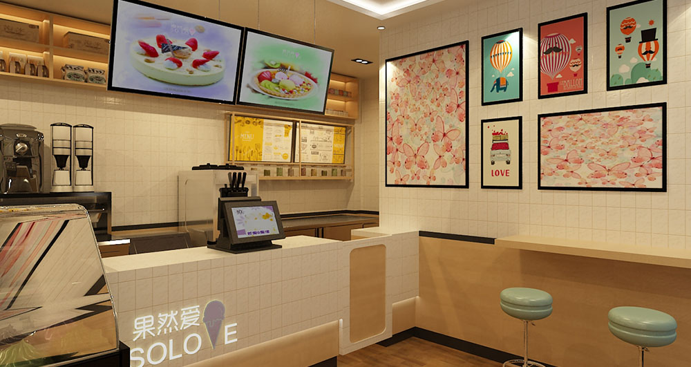 店铺地址:泰安市泰安力明科技学院内商业街 店铺面积:28㎡ 项目造价:3万左右 设计说明:冰淇淋店铺设计以清新明亮为主,色彩鲜艳的仿生画使人食欲大增,粉色系的撞色桌椅设计,清新而不做作。墙面装饰挂画也以小清新为主,营造温馨浪漫而不失甜蜜的休闲气氛。